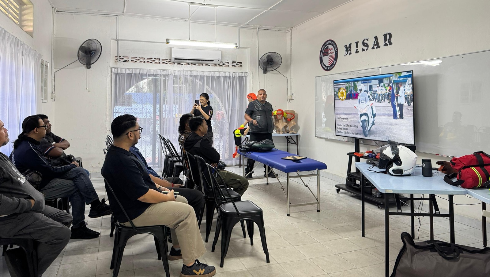 Participants listening attentively during the P-Hailing Bikers Safety & Emergency Survival Programme training session.