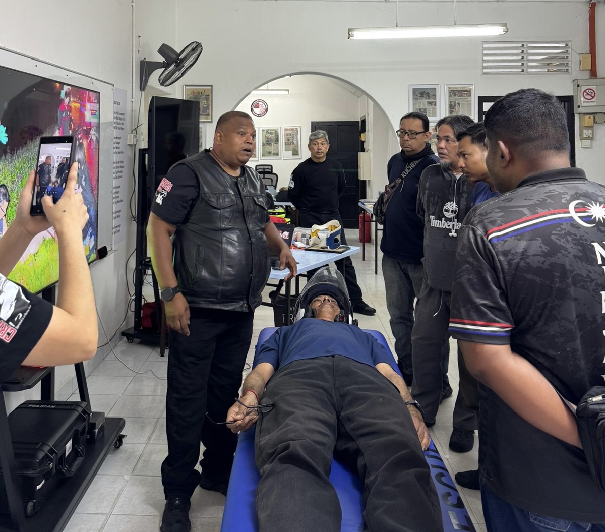 Hands-on demonstration of emergency response techniques for bikers during the P-Hailing Bikers Safety & Emergency Survival Programme.