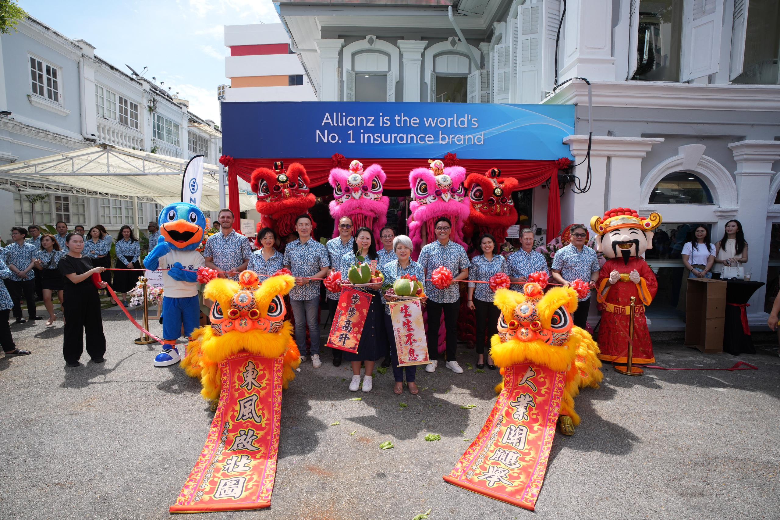 Allianz Malaysia Chief Executive Officer, Sean Wang (5th from left); Allianz Life Insurance Malaysia Berhad Chief Executive Officer, Charles Ong (extreme right) and Allianz Malaysia Chief Financial Officer Giulio Slavich (4th from right) with senior management of Allianz Malaysia Berhad posing with words of encouragement and for business to thrive and prosper for the branch with the lion.