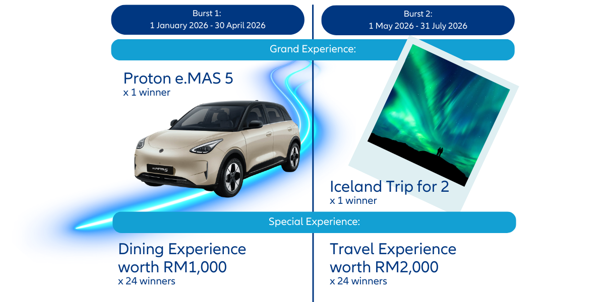 - On top of these grand experiences, 24 customers will also be in the running to enjoy exclusive dining experiences worth RM1,000 each under Burst 1 of the campaign, while Burst 2 extends the excitement with travel experiences worth RM2,000 each for another 24 customers. In total, the campaign offers prizes worth up to RM200,000, celebrating both the everyday moments and aspirational experiences that enrich life.