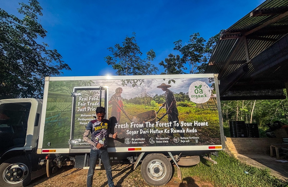 An Orang Asli community representative with a delivery vehicle used to transport locally grown produce, supporting income generation and market access.