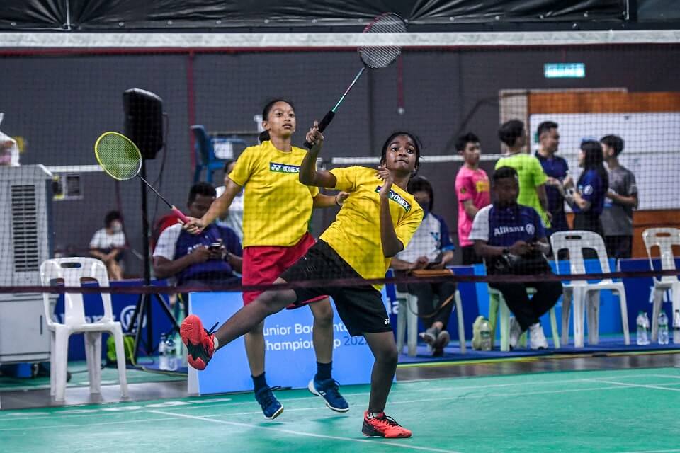 Nur Aina Maisarah Muhammad Hatta (back) and Baavanya Arumugam in action during the girl’s doubles at the Allianz Junior Badminton Championship (AJBC) 2022 Qualifying Round Four in Ipoh.