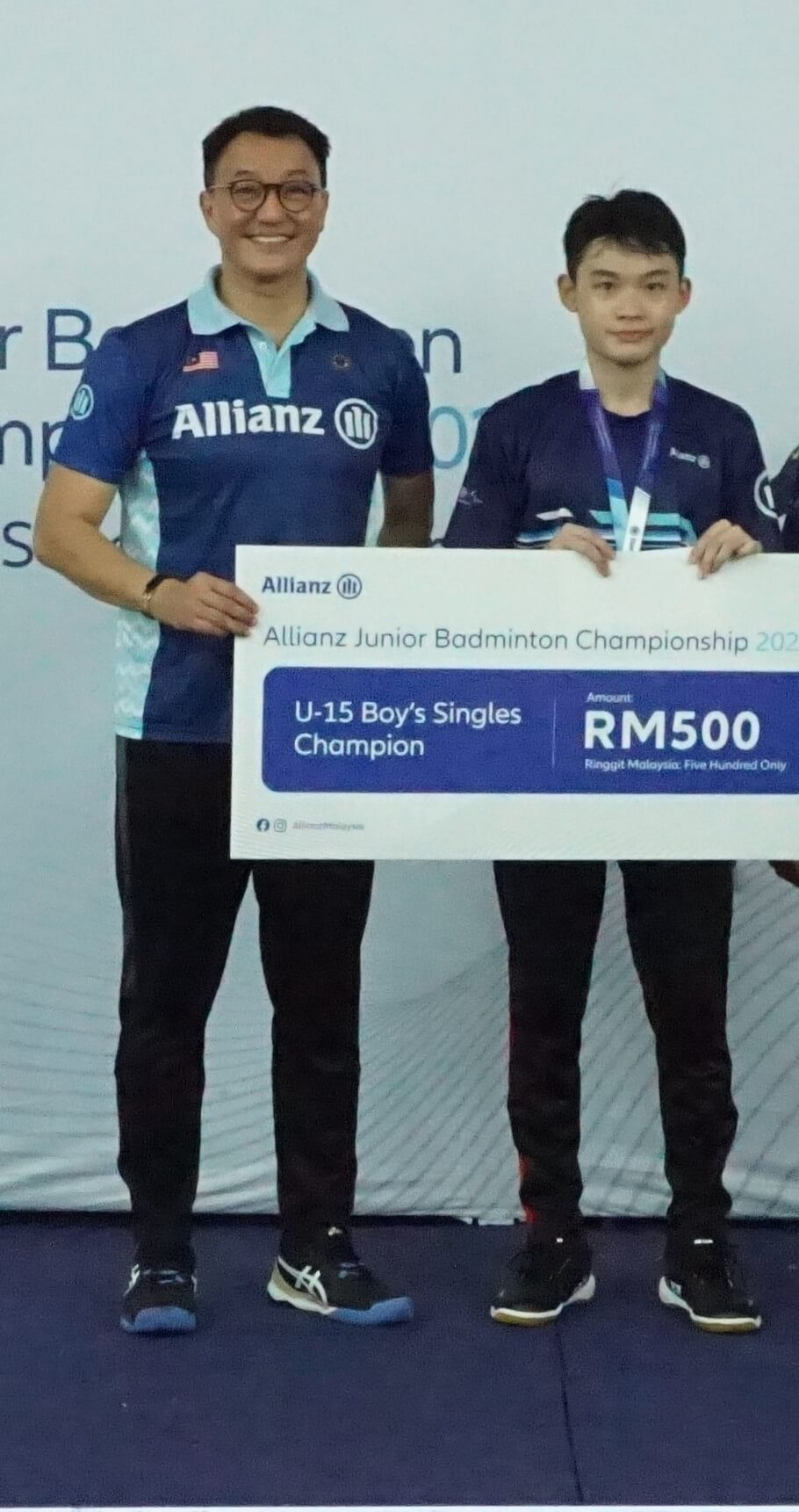 Allianz Malaysia Berhad Chief Executive Officer, Sean Wang (left) with Branson Hee of SMK Bandar Puchong Jaya B, the Boys U-15 Singles and Doubles champion.
